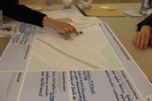 They introduce themselves, read their assignment, then they go outside. They walk across five locations in the district. At every spot they stop – look – argue. Is this place right? Too loud? Too hidden? Perfect at noon, useless at night? How can you access it? Where could the next supermarket be located? What do I expect from the place? What will people living here in 20 years need?
